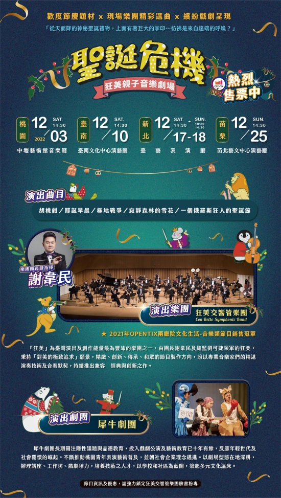 一、節目介紹:狂美交響管樂團自 2017 年起,致力打造以「管樂」為基底,跨界呈現的【狂美親子音樂劇場】,所推出之精彩節目,廣受觀眾好評。本次將再度與犀牛劇團為孩子打造〝節慶感〞新作《聖誕危機》,一起探討大自然環境共存議題,盼在溫馨的聖誕佳節前夕,給孩子與父母們擁有一場溫馨美好的看戲時光。