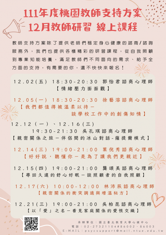 | 二、 | 為提供本市教師全面性的服務資源及促進自我覺察、自我照顧、情緒調節,以達身心健康之效,國立臺北教育大學(心 理諮商暨健康促進研究中心)自 111 年 12 月 2 日至 12 月 21 日止 ,共規劃 7 場教師研習線上講座。請轉知所屬並參考附件所列之 QR Code 進行報名。(報名網址: https://reurl.cc/101DN9 ) |