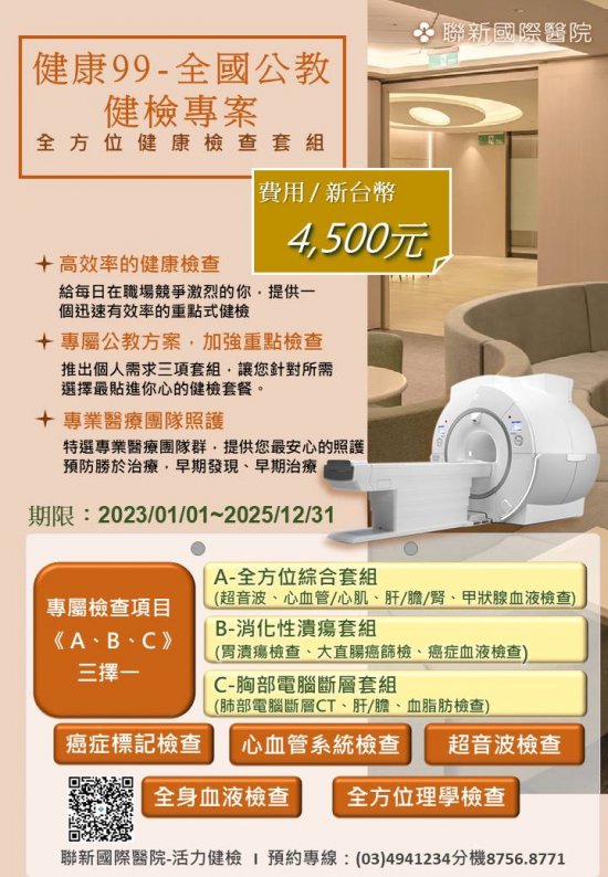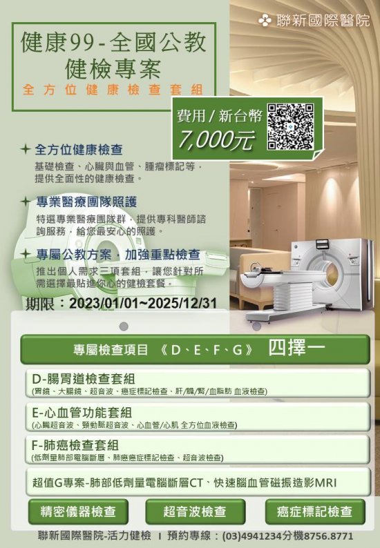 一、 依據行政院人事行政總處 2023~2025 健康 99─全國公教健檢方案,本院獲選為方案之特約醫療院所,特規劃健康 99─全國公教健檢 4500 元專案、 7000 元專案及 16000 元專案(附件一、附件二及附件三)及活動 DM (附件五、附件六)供貴單位同仁酌參選擇,並以專案方式提供個人或團體預約受檢,附上體檢預約單(附件四)或直接來電即有專人服務。 二、 本方案含同行眷屬、單位約聘人員及工友均可依此優惠方案一併辦理,敬會貴單位公告所屬同仁知悉。