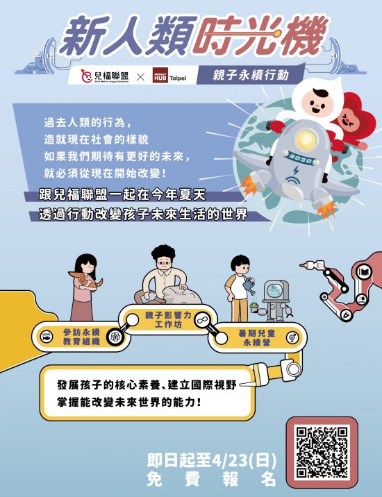 主旨: 從微小的行動開始改變世界,《新人類時光機》計畫報名申請至 4 月 23 日,兒福聯盟今年攜手 Impact Hub Taipei 舉辦首屆親子永續行動孵化器,透過親子影響力工作坊、暑期兒童永續營及參訪永續教育組織等培訓,發展孩子的核心素養、拓展國際視野,掌握能改變未來世界的能力!懇請貴單位協助宣傳本次計畫。