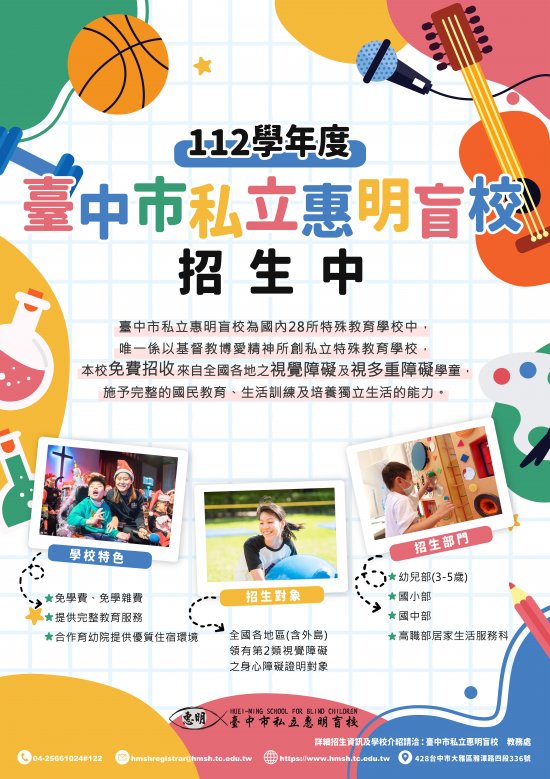 一、 依據臺中市私立惠明盲校 112 年 3 月 29 日惠明註字第 1120200020 號函辦理。 二、 該校招生對象為視覺障礙者重度或以視覺障礙為主之多重障礙學生優先,請轉知 112 學年度有意轉安置該校且符合該校招收對象之學生家長。 三、 旨揭簡章及海報可至本市特殊教育資源網(網址: https://special.tyc.edu.tw/index.php)→特殊教育科→最新消息下載參閱。