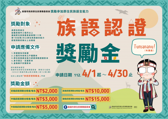 一、 依據高雄市政府原住民事務委員會 112 年 3 月 30 日高市原民教字第 11230380100 號函(如附件 1)暨高雄市政府原住民事務委員會獎勵參加原住民族語言能力認證測驗作業要點辦理。
