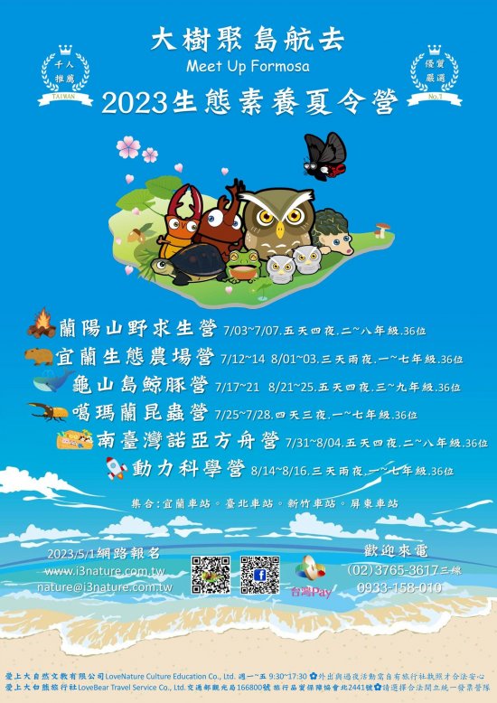 主旨: 函轉愛上大自然文教有限公司為響應 2023 世界地球日(Earth Day)真心愛護地球理念,將於暑假辦理【大樹聚。島航去】2023 生態素養夏令營,詳如說明,請查照。