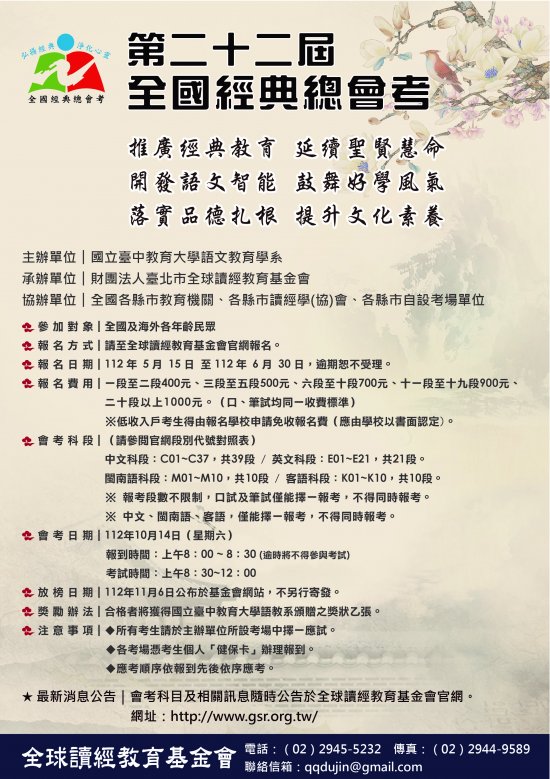 財團法人臺北市全球讀經教育基金會辦理「第22屆全國經典總會考海報」,