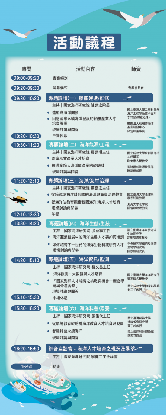 二、 為配合第四屆國家海洋日系列活動,國家海洋研究院特舉辦 旨揭論壇,以「邁向下一個十年的永續海洋」為主題,共辦 理 6 場次專題講座(船舶建造/維修;海洋能源/工程;海洋/ 海岸治理;海洋生態/生技;海洋資訊/監測;海洋科普/素 養)進行分享。