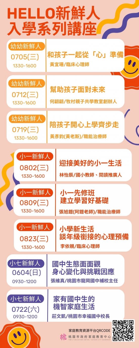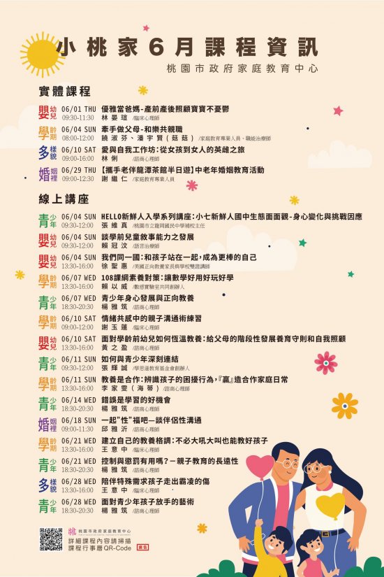 檢送本中心「小桃家 6 月課程資訊」、「Hello!新鮮人入學系列講座」、「Hello!新鮮人」海報各 1 份,提供學校推展家庭教育運用,惠請貴校協助刊登網站、公佈欄或家長群組,請查照。