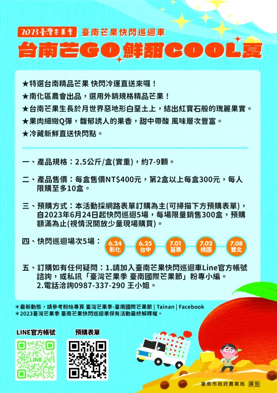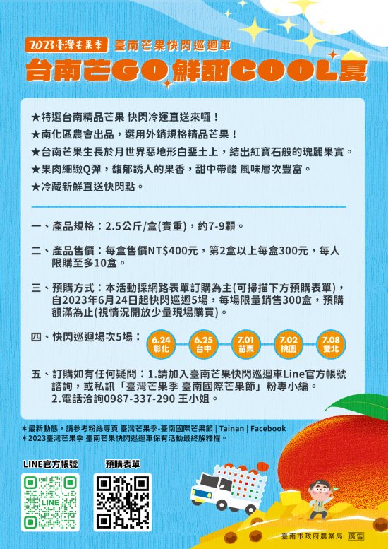 轉知-函轉有關「臺南芒果快閃巡迴車」來囉!臺南市外銷精品芒果冷運直送各相關縣(市、區)轄下取貨點,詳如附件,請協助於官網、社群公告週知並轉知相關里長辦公室協助推廣,請查照。