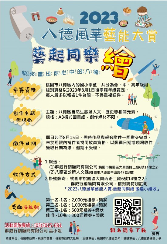 一、為鼓勵國小學童透過「繪畫」方式一同探掘八德之美、展現八德在地特色,以學童的獨特見解與角度展現八德區的人文與自然生態,同時創作過程中也讓孩童能更加領略、記憶八德在地文化與特色,因此規劃辦理「2023 八德風華藝能大賞‧藝起同樂繪」活動。