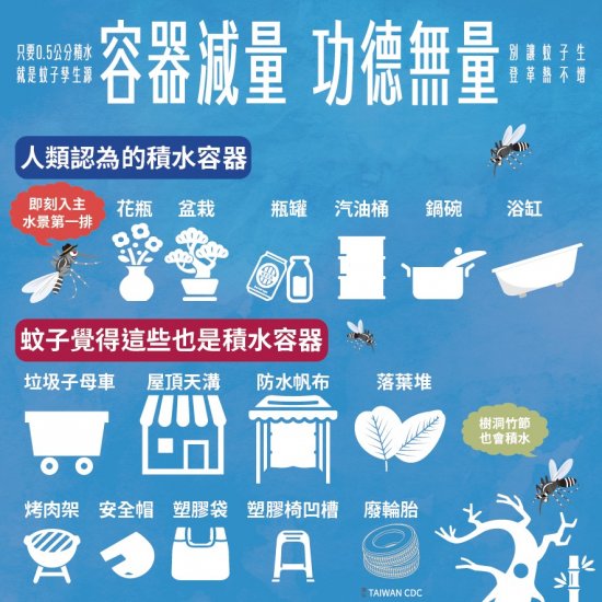 二、 清除孳生源與滅蚊是登革熱防治的不二法門,且近日各地常有強陣雨,雨後積水都可能成為病媒蚊孳生的溫床,定期巡查戶內外環境,並即時清除積水容器,落實「巡、倒、清、刷」工作,針對校舍、農園、空屋、空地及相關工程工地等登革熱高風險場域亦須加強孳生源清除與查核工作。