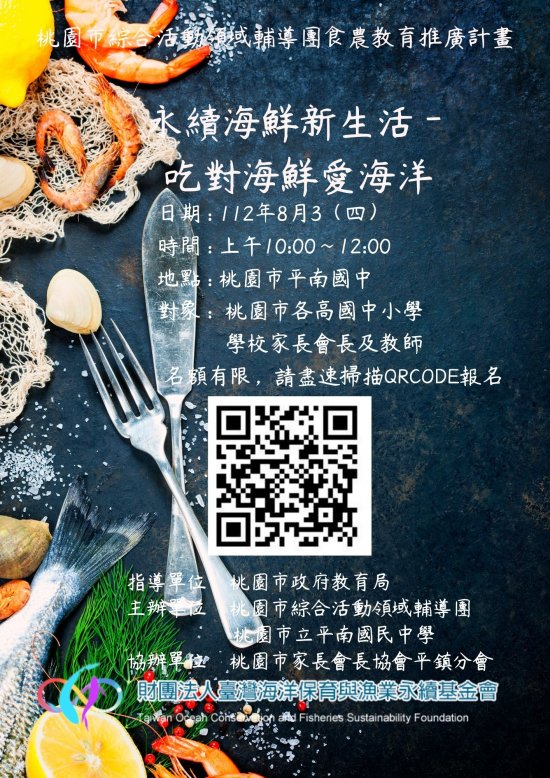 轉知-本校辦理桃園市綜合輔導團食農教育推廣計畫「永續海鮮新生活-吃對海鮮愛海洋」敬邀貴校家長會長及教師參加,請查照。