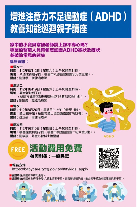 二、 注意力不足過動症( ADHD )是兒童期常見之神經發展障礙,為提升民眾及家長對注意力不足過動症( ADHD )之認識並知道如何尋求專業的協助,爰辦理旨案活動共計 4 場次,本次活動免費並採線上報名( https://babycare.tycg.gov.tw/#/tykids-apply)請各校廣為宣導,詳請參考附件計畫。