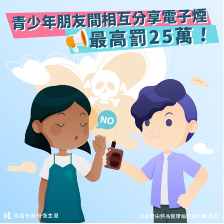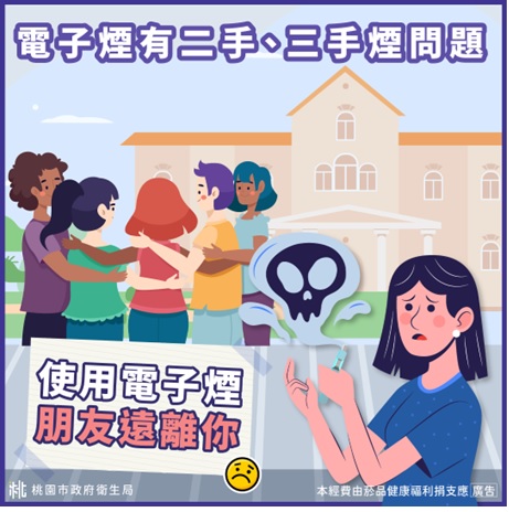 二、 為保護本市青少年免於電子煙危害及降低其使用率,該局製作「電子煙危害」衛教宣導圖卡 3 篇,希冀以圖象情境提升其電子煙危害相關識能,建立學生對拒菸技巧及瞭解菸害防制法規定。