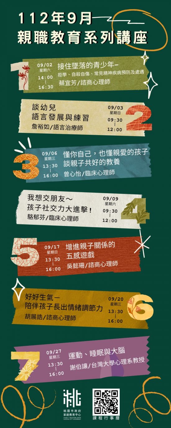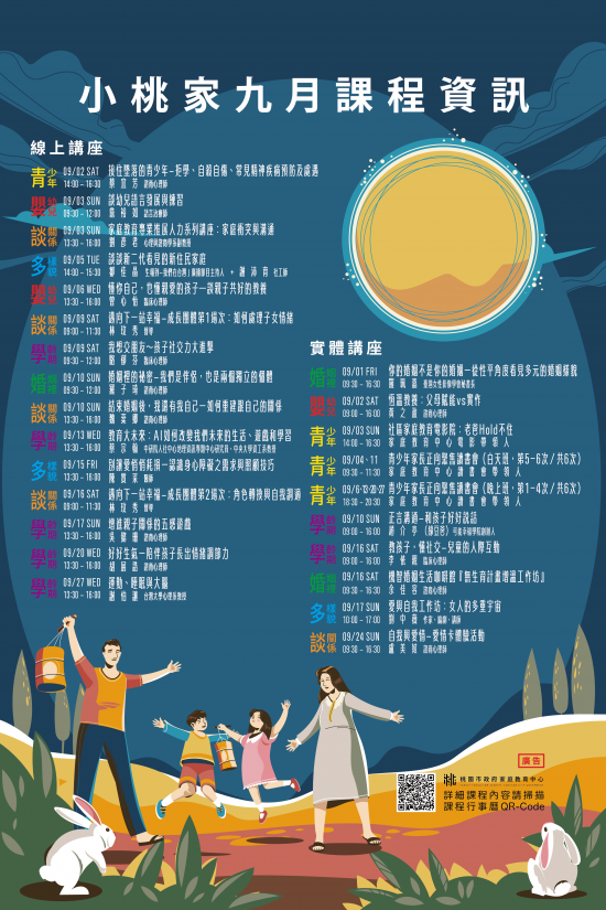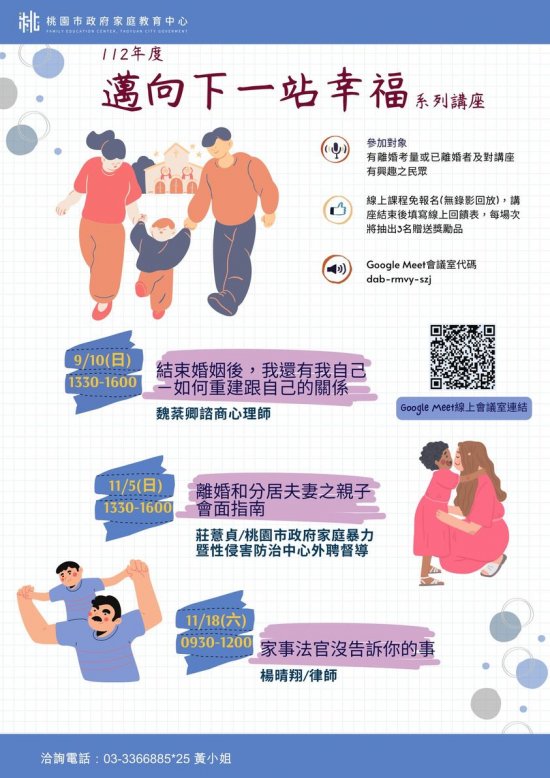 | 二、 | 旨揭課程詳細資訊,請見課程行事曆( https://reurl.cc/xlGyGL );另倘有家庭教育個別化服務需求,可撥打 4128185 諮詢專線或申請小桃家線上諮詢室( https://reurl.cc/oZWOY5 )服務。 |