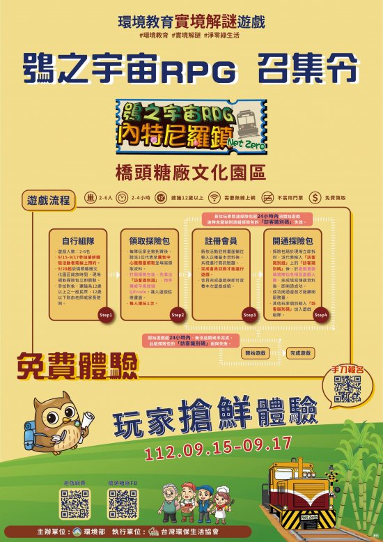 主旨: 有關環境部環境保護司於橋頭糖廠文化園區辦理「鴞之宇宙 RPG-內特尼羅(Net Zero)鎮環境教育實境解謎遊戲」活動一案,請查照。