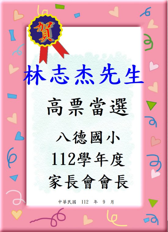 恭禧林志杰先生高票當選本校 112 學年度家長會會長,為八德國小奉獻心力,將讓八德國小教育事務蒸蒸日上、發光發熱!
