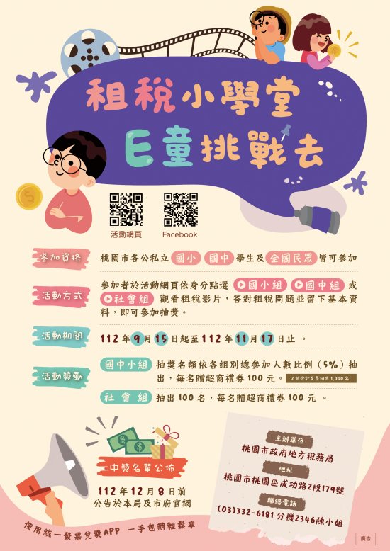 (三)活動方式:參加者依據身分別點選「國小組」、「國中組」或「社會組」,於活動頁面觀看租稅影片後,正確回答租稅問題並留下基本資料者,即可參加抽獎。