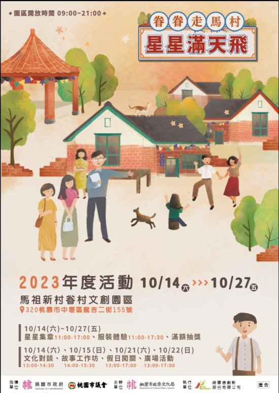 說明: 一、活動訂於 112 年 10 月 14 日至 10 月 27 日假本局所轄中壢馬祖新村眷村文創園區辦理,包含實境解謎、換裝體驗、文化對談、工作坊、假日闖關等多項活動,期推廣眷村文化保存。 二、鼓勵學生利用假日參觀。