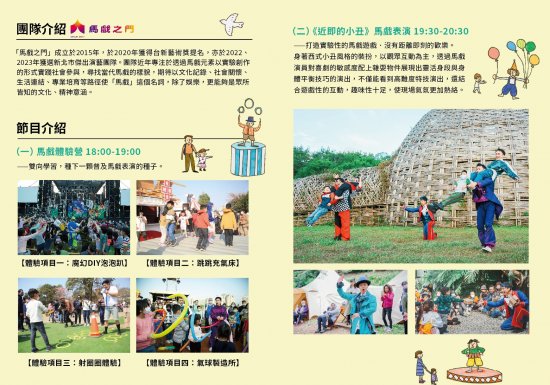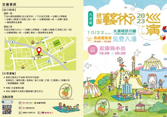 說明: 一、演出及體驗活動預定於 112 年 10 月 22 日(星期日)晚間 6 時假大溪埔頂公園半月形廣場辦理, 7 時 30 分正式演出。 二、檢附本場次活動 EDM 、節目內容及活動宣傳文字,惠請貴單位於官網及粉專、相關宣傳管道協助網路宣傳。