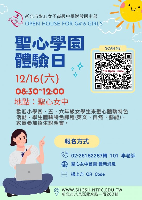 | 主旨: | 檢送本校辦理 112 學年度聖心學園課程體驗活動,敬祈 貴校協助公告並鼓勵小學四、五、六年級女學生及家長踴躍參加,請查照。 |