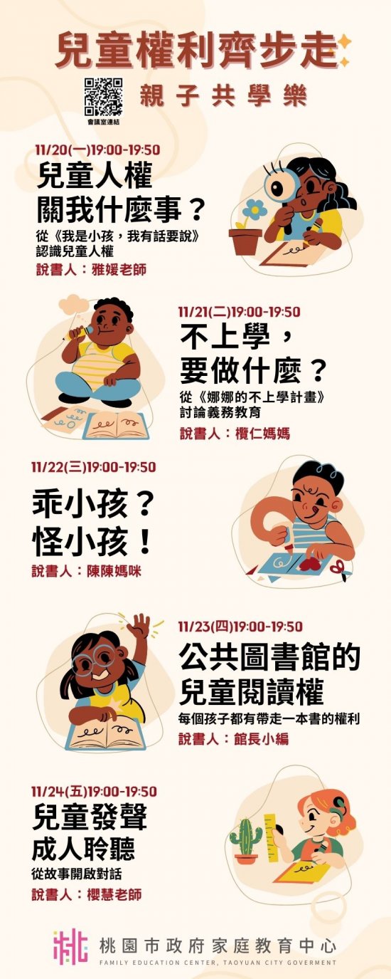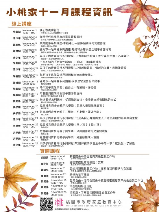 | 主旨: | 檢送本中心「小桃家 11 月課程資訊」、「兒童權利齊步走親子共學樂」及「與孩子的青春同行系列課程」海報各 1 份,惠請貴機關(學校)運用多元管道加強宣導,請查照。 |