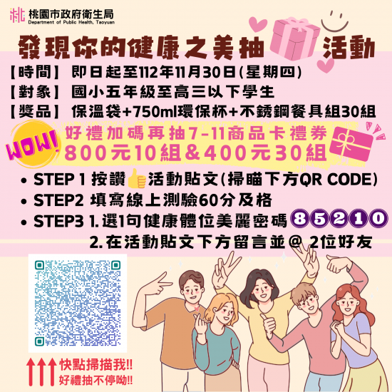 (一) 活動網址:桃園市社區營養推廣中心 Facebook 專頁「發現你的健康之美」抽獎活動( https://reurl.cc/bldREy )。