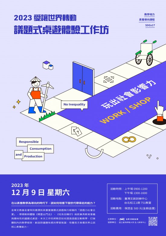 | 一、 | 金車文教基金會長期深耕國際素養教育,定期辦理教師增能課程,本次工作坊特別邀請到「遊戲力社會企業」,從 SDG10-消弭國家不平等和 SDG12-永續生產與消費主題出發,帶領教師體驗《精靈出門去》、《哇係田橋仔》兩款兼具教育意義與趣味性的議題式桌遊。課程中將分享如何透過遊戲導向式教學,跳脫傳統教學框架,創造對議題有感的學習氛圍,培養孩子具備「問題解決」、「團隊合作」、「行動實踐」的世界公民核心素養能力。 |