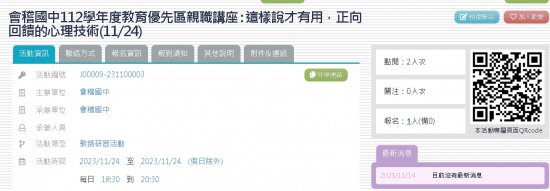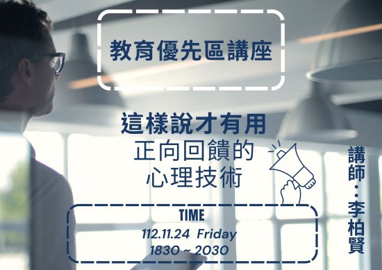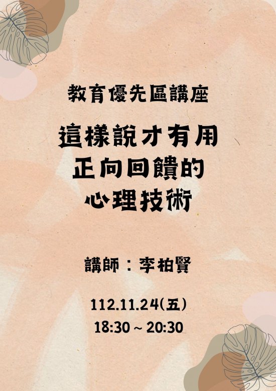 | 主旨: | 本校辦理「112 學年度教育優先區親職教育講座~這樣說才有用,正向回饋的心理技術」,敬請協助公告並鼓勵貴校教職員工、家長及社區人士踴躍參加,請查照。 |
