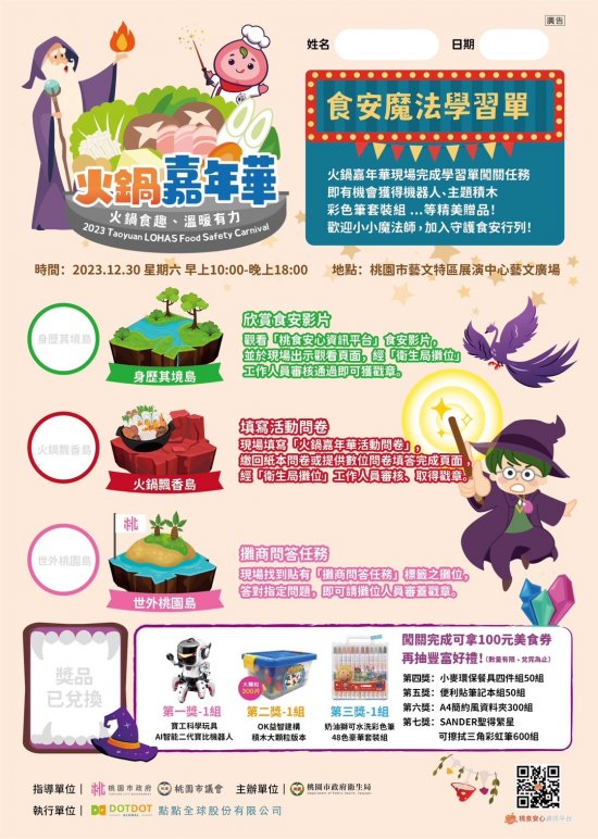 | 二、 | 衛生局訂於 112 年 12 月 30 日上午 10 時至下午 6 時假桃園藝文廣場(地址: 桃園市桃園區中正路 1188 號)辦理 112 年度桃園市「火鍋嘉年華」活動。 |