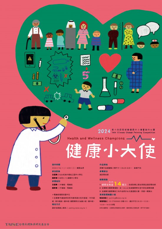 | 一、 | 本會主辦之「氣候變遷國中小繪畫創作比賽」迄今已舉辦 13 屆,累計 43 國、 65,352 名學子參與。本屆(第 14 屆)為呼應聯合國永續發展目標(SDGs)的第 3 項,「健康與福祉」,以「健康小大使」為主題,提升師生對傳染疾病的認知並共同探討如何預防,同時學習健康的生活方式、情緒管理等,藉以充分了解 SDG 3 之各項子目標內容,攜手邁向健康、平安生活。本賽事並積極回應 SDG 13「氣候行動」,鼓勵師生改變行為並積極行動,落實相關教育及提升大眾意識。。 |