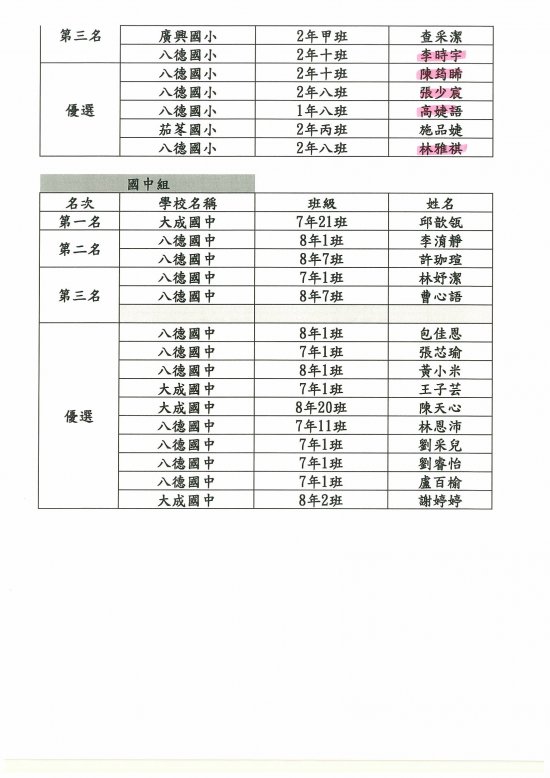 恭喜以上請得獎同學。請家長陪同小孩自行前往領獎。