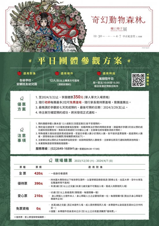 | (二) | 適用條件: 12 人(含)以上購票,可另提供隨行老師最多 2 位免費進場,隨行家長需持票進場。 |
