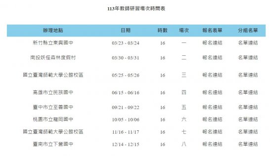 | 8、 | 第八場次臺南場: 113 年 12 月 14 日(星期六)至 12 月 15 日(星期日);研習地點:臺南市立下營國中;報名連接: https://forms.gle/HTUz3ydUn3rFK7Bd8 。 |