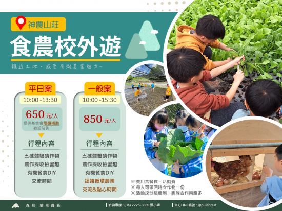 | 三、 | 該會自 2017 年起即致力推動食農教育活動,迄今已累計逾 7,000 參加人次,為鼓勵師生參與,提供限額補助部分活動費用,活動說明網址: https://reurl.cc/L4Vqa9 。 |