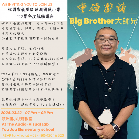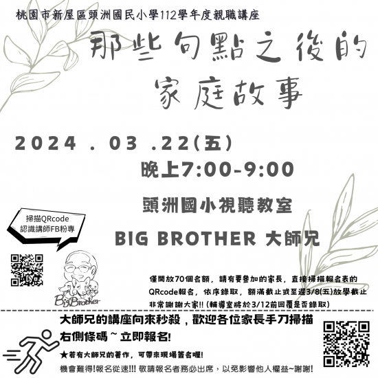 | 二、 | 本活動相關訊息如下: (一)時間: 113 年 03 月 22 日(五)晚上 17:00-19:00 (二)地點:本校視聽教室 (三)講師:大師兄 老師 (四)主題:那些句點之後的家庭故事 |