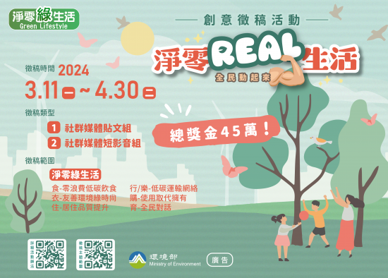 二、 旨揭徵稿活動目的旨在為鼓勵民眾從日常生活中落實淨零綠生活轉型,以簡單明瞭又易於實踐的方式,結合現今社群媒體分享,擴大宣導層面,深入民眾生活與日常以響應淨零綠生活,「淨零 Real 生活」徵稿主題包括「食-零浪費低碳飲食」「衣-友善環境綠時尚」「住-居住品質提升」「行/樂-低碳運輸網絡」「購-使用取代擁有」「育-全民對話」六大面向。