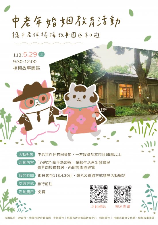 | (四) | 活動內容:「心約定-牽手新旅程」講座、導覽楊梅故事園區,一覽楊梅國中校長及教職員宿舍群、感受民間興學、自力建校、客家尊崇學風的人文精神與楊梅獨有的在地文化。 |