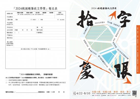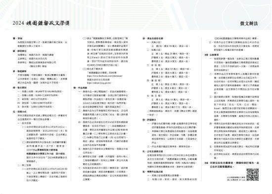 主旨:檢送「2024桃園鍾肇政文學獎」徵文海報、簡章、摺頁各1份,請惠予協助公告轉知並鼓勵踴躍參加,請查照。