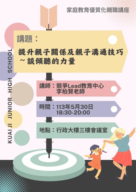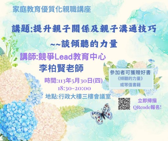 | 主旨: | 本校辦理「家庭教育優質化計畫」親職講座,敬請協助公告並鼓勵貴校教師、家長及社區人士踴躍參加,請查照。 |