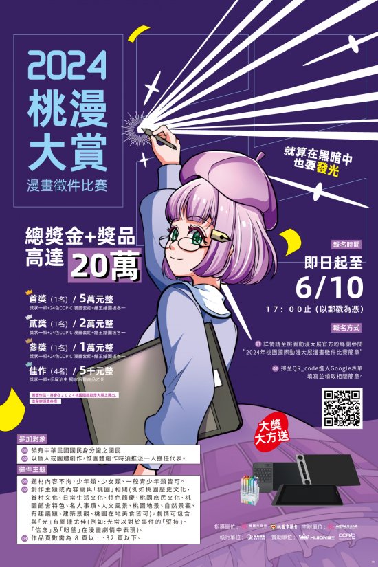 說明: 一、為發揚臺灣原創漫畫創作能量,給予全國漫畫有志之才展現能力的舞台,本局規劃辦理旨揭活動,報名時間自即日起至本(113)年 6 月 10 日 17 時止(以郵戳為憑)。 二、入選作品將於「2024 桃園國際動漫大展」展出,預計於本(113)年 7 月 6 日至 21 日假中原文創園區辦理,期為臺灣動漫產業灌注新興能量。