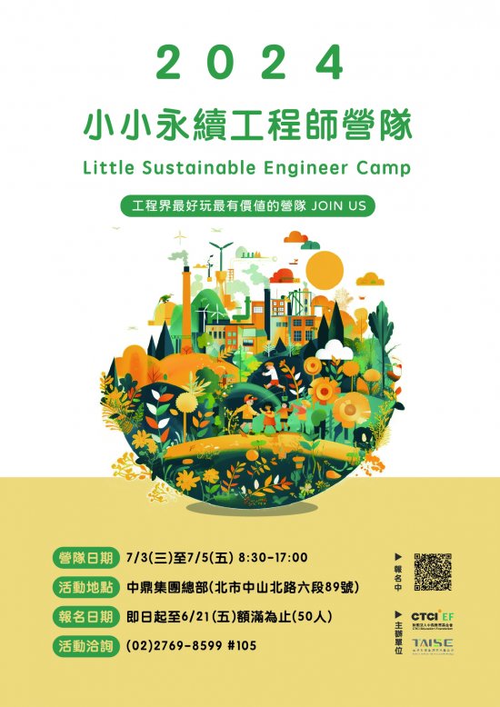 | 一、 | 聯合國永續發展目標(SDGs)已是全球政府、教育、企業領域的共通語言,永續發展教育(ESD)與永續發展目標之整合運用係全球最新趨勢。本會主辦「2024 小小永續工程師營隊」期能提升國小學童在環境永續、工程領域相關的專業知能,培養其創造力與自主學習力。 |