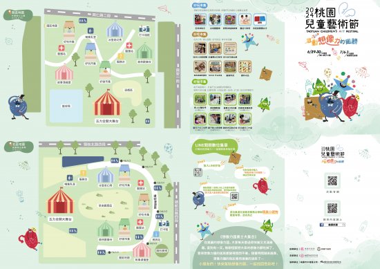 說明: 桃園市政府文化局為推廣兒童藝術啟蒙與在地藝文紮根,規劃辦理「2024 桃園兒童藝術節」活動,活動內容包含兒童市集、小型表演、故事劇場、主舞台大型演出,辦理時間及地點如下: (一)南區主題活動: 6 月 29 日(星期六)至 30 日(星期日)下午 4 時至晚間 8 時假中壢區興仁親子公園辦理。 (二)北區主題活動: 7 月 6 日(星期六)至 7 日(星期日)下午 4 時至晚間 8 時假大園區桃園陽光劇場辦理。