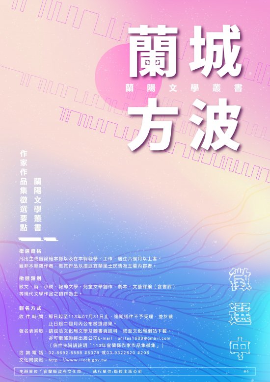 主旨:檢送本局113年「蘭陽文學叢書作家作品集」徵選簡章、報名表及海報各1份,請轉知所屬並協助於網站刊登活動訊息,請查照。