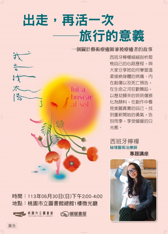 | 二、 | 本館特邀沐潮品牌創意總監、星宇航空全媒體《 kiânn 》的設計總監-西班牙檸檬,透過著作《我去找太陽了》,暢談流浪西班牙十幾年的心靈冒險故事,與讀者分享她如何學習溫柔接納身體的病痛、內在創傷以及死亡預告,及如何藉由藝術治療療癒了自己。期望以過來人的親身經歷與著作分享,鼓勵民眾從閱讀開始,驅散心中的烏雲,告別雨季,重新找回生命裡的陽光。 |