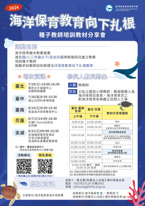 | 主旨: | 轉知海洋委員會海洋保育署辦理「海洋保育教育向下扎根種子教師培訓教材分享會」活動資訊一案,詳如說明,請查照。 |
