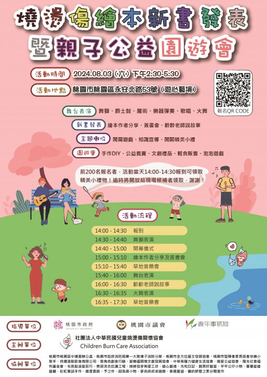 | 主旨: | 函轉社團法人中華民國兒童燒燙傷關懷協會訂於 113 年 8 月 3 日辦理「燒燙傷繪本新書發表暨親子公益園遊會」活動,請查照。 |