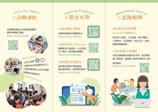 | (一) | 小桃家線上諮詢室:提供年滿 18 歲以上之桃園市民每月一次之線上諮詢服務,倘有親職教養、家人關係及家庭資源管理議題,歡迎逕至本中心網站申請及預約(預約連結: https://reurl.cc/oZWOY5 )。 |