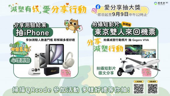 | 二、 | 環境部為鼓勵社會大眾及莘莘學子在暑期假期間一起跟上全球減少塑膠的風潮,特辦理「減塑有我」愛分享行動,可透過臉書(Facebook)、 Instagram(IG)等社群媒體,拍攝個人生活中減塑短影片、減塑生活照片,並可透過參加 「你來自哪個星球?」心理測驗遊戲,瞭解並發覺屬於自己獨特的環保行動,歡迎民眾邀請親朋好友一起在生活中響應減塑行動,參加旨揭活動拿大獎。 |
