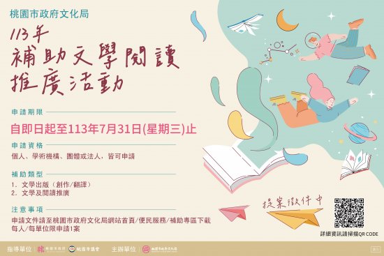 主旨:本局「113年補助文學閱讀推廣活動第三期實施計畫」自即日起至113年7月31日受理補助申請,請惠予協助公告周知所屬機關及相關團體或個人踴躍申請提案,請查照。