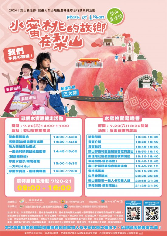 | 主旨: | 函轉臺中市和平區公所訂於 113 年 7 月 20 日起辦理「2024 梨山森活節.促進大梨山地區農特產聯合行銷系列活動-水蜜桃的故鄉在梨山」,敬請惠予協助於貴單位網站及臉書粉絲團等公告宣傳,並竭誠歡迎蒞臨指導案,請查照。 |