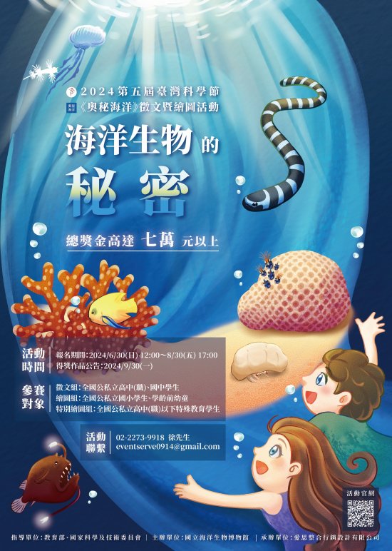 | 主旨: | 轉知國立海洋生物博物館辦理「2024 第五屆臺灣科學節《奧秘海洋》徵文暨繪圖活動」一案,請查照。 |